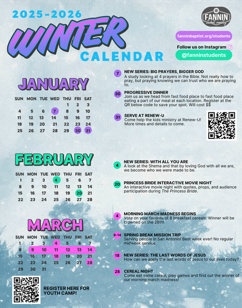 We are starting a new discipleship journey for our teens this year. Each grade has a theme for the year, and each grade has different goals to try and hit for the year (evangelism, worship, fellowship, service, discipleship, a book to read, a devotional book to go through, Scripture to memorize and books of the Bible to read). Students are not required but encouraged to sign up at the QR code!